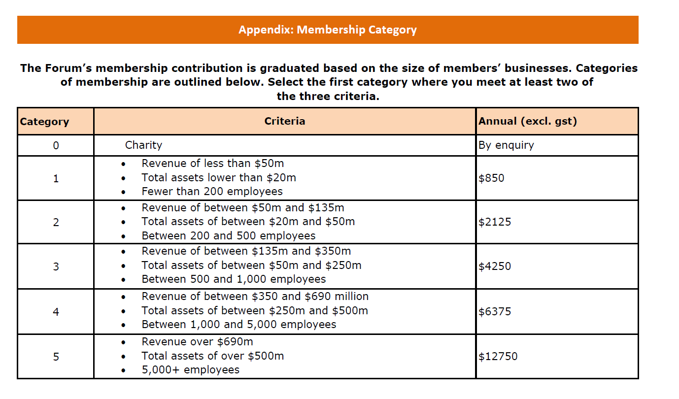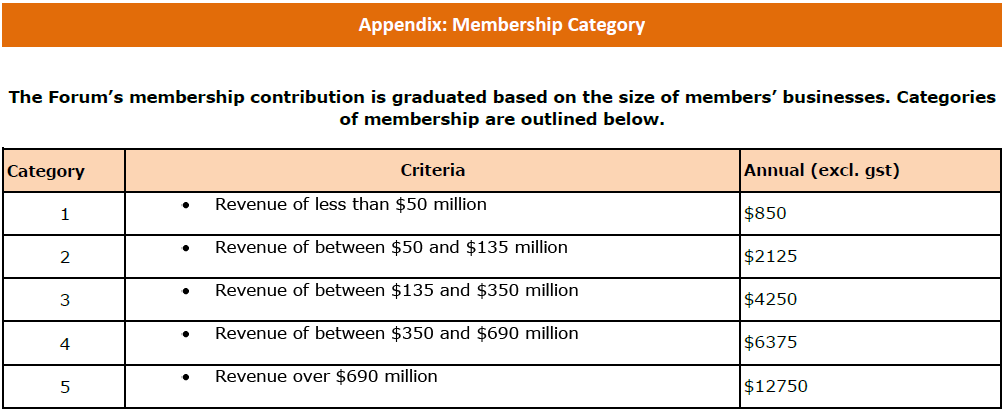 Members support and invest in the Forum by paying an annual membership fee which covers all events and attendance at Forum events and the development of resources. The Fee is graduated to recognise the variable size of Forum member organisations. All annual fees are exclusive of GST.